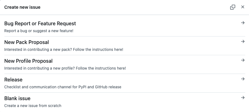 diffpy.cmiissues page on GitHub and click New Issue. Select the “New Pack Proposal” template. Fill out the template with the name of your pack and open the issue.
