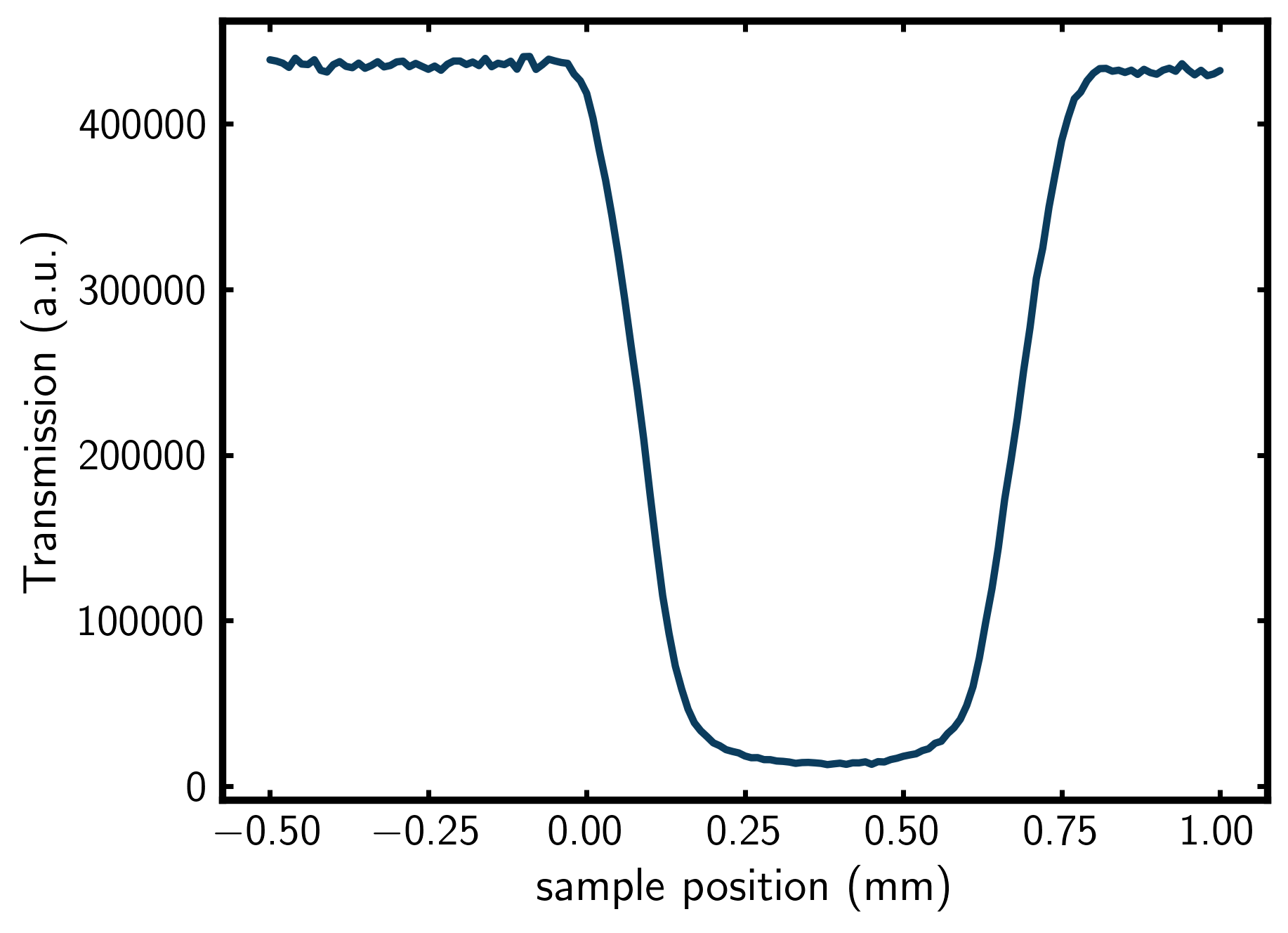 A “z-scan” measurement is the measured transmission of your X-ray incident beam as a function of sample position. This is obtained by moving the sample perpendicular to the X-ray beam (z-direction) and recording the transmitted intensity at each position. This measured data looks something like this,