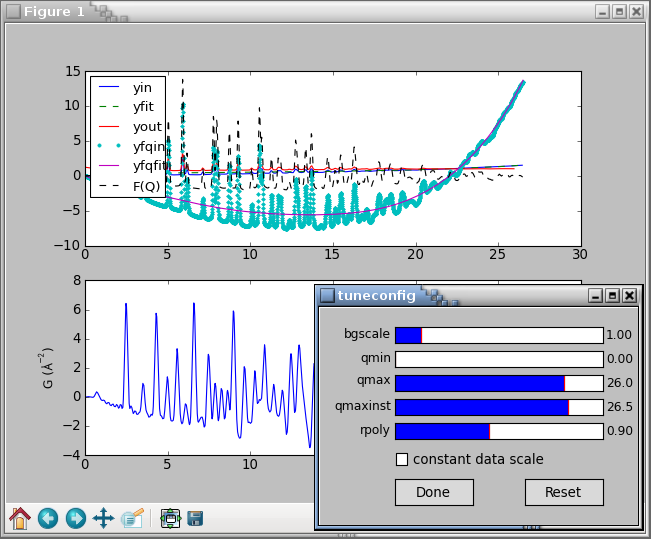 This will save two files Au_DNA_NPA.fq, Au_DNA_NPA.gr in the same directoy for the F(Q) and G(r) functions. This also plots F(Q) and G(r) functions in a pop-up window and the processing parameters such as rpoly or so may be tuned interactively by issuing command tuneconfig() in the IPython session as discussed above.